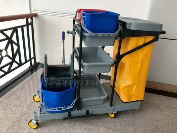 Janitorial Trolleys and housekeeping carts hold cleaning supplies, trash receptacles, and other...